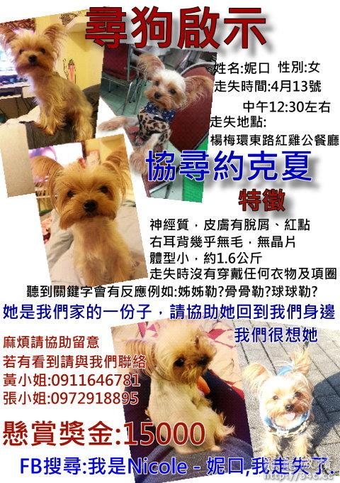 我的狗狗[size=5][color=DarkRed]約克夏[/color][/size] 2014/4/13在楊梅走失了有請當地里長廣播了、海報也印了上千份、附近的寵物店也都貼海報了,但到目前為止都還沒有下文.....