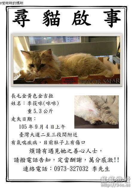 對不起!!!因為我找不到可以發表我要請求協尋貓咪的地方~所以只好發文到這邊!!請原諒我急尋愛貓的慌亂..請大家幫幫我!!求求各位幫忙!!~懇請請各位朋友幫幫忙!!我家的毛小孩不見了!!她是長毛虎斑紋金吉拉.八歲已經結紮..但她有先天性的氣喘最近肚子還有一個很大的舔舐傷口需要持續打針吃藥...她是在105年9月4號早上9點走失在台中市政府台灣大道~大墩路全聯路口這段路..她很膽小怕生胖嘟嘟的5.5公斤...請各位多多幫幫忙尋找或是轉PO幫幫我!!謝謝各位朋友感激不盡..請大家幫幫我!!求求各位幫忙!!~