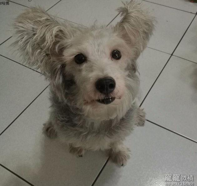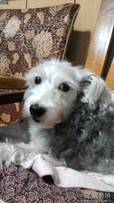 品種是雪納瑞和馬爾濟思混種,脖子戴項圈,顏色是紫色,狗牌是狗骨頭的形狀,