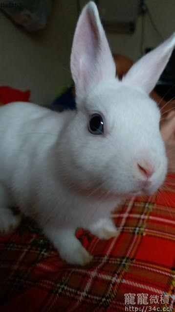 目前約5個月大,全白毛+藍眼,母兔,體重不到1公斤