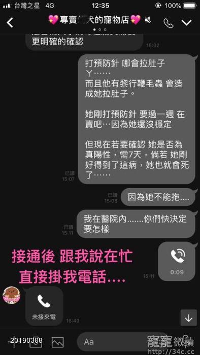 (你搞清楚,當下狗有問題,我立馬連線告知你,你回到一半,看到我又說狗狗有「犬小病毒腸炎」你直接已讀不回!我打給你,問你怎麼處理,你回覆我,我在忙 有客人,直接掛我電話!)