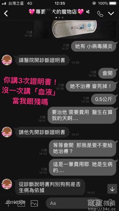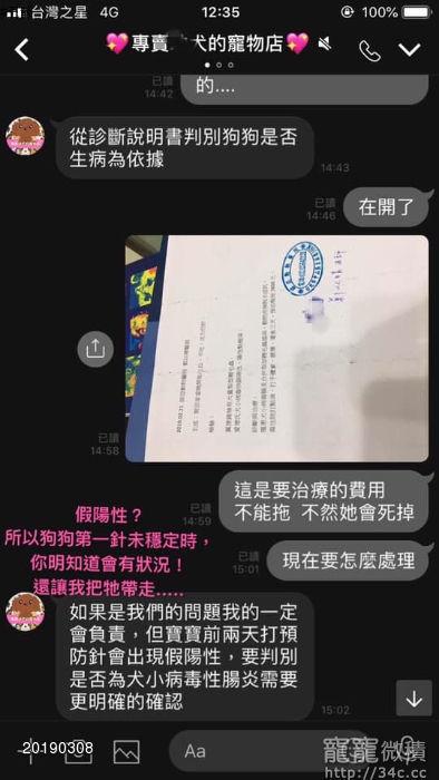 如果是我們的問題我的一定會負責,但寶寶前兩天打預防針會出現「假陽性」,要判別是否為犬小病毒性腸炎需要更明確的確認。(此時我早已傳給寵物店了,他一直否定醫院開出來的任何證明)