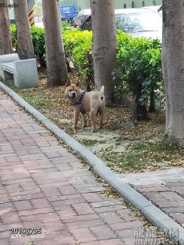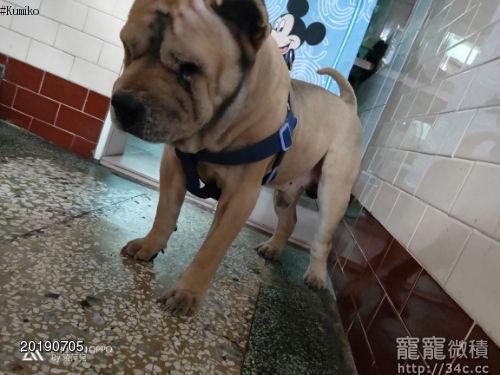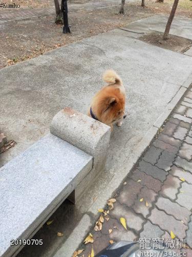 鬆獅老犬 全身剃毛 揹藍色胸背帶