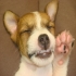 ,五個月大,約有黃金獵犬成犬大小,前腳穿有褐色長襪,眉毛有褐色標記,